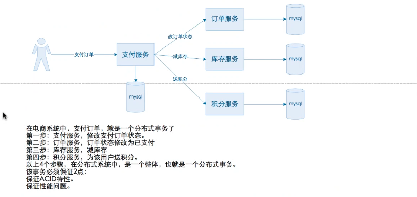 分布式事务,是指一个业务需要同时操作多个数据库的情况下,而且必须保持ACID的特性。一般应用于微服务的多服务处理。